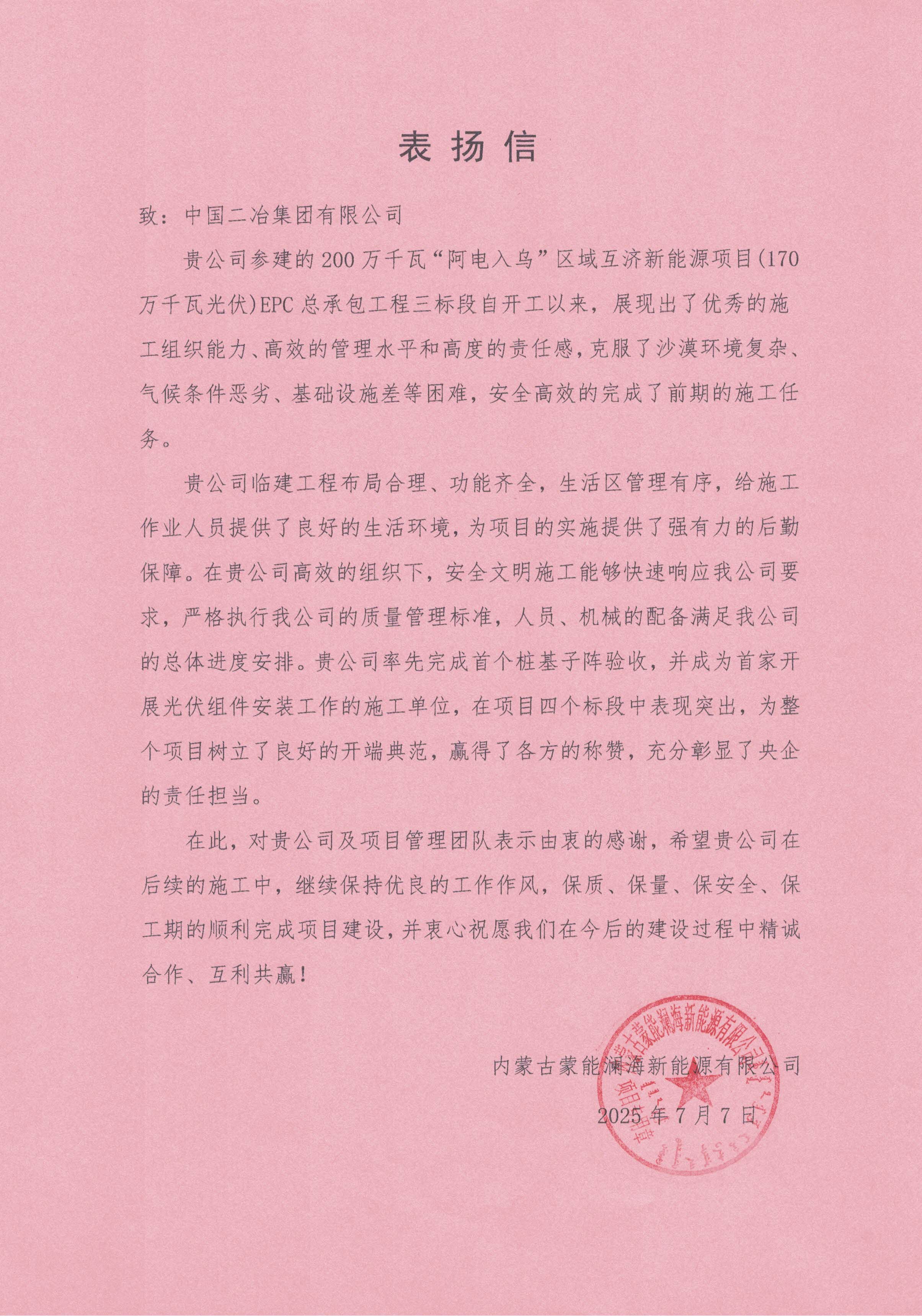 近日,中國(guó)二冶收到內(nèi)蒙古蒙能瀾海新能源有限公司表?yè)P(yáng)信,對(duì)中國(guó)二冶200 萬(wàn)千瓦“阿電入烏”區(qū)域互濟(jì)新能源項(xiàng)目(170萬(wàn)千瓦光伏)EPC總承包工程三標(biāo)段施工中的出色表現(xiàn)予以高度肯定。